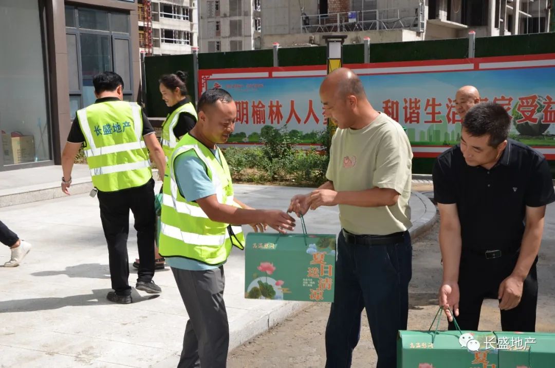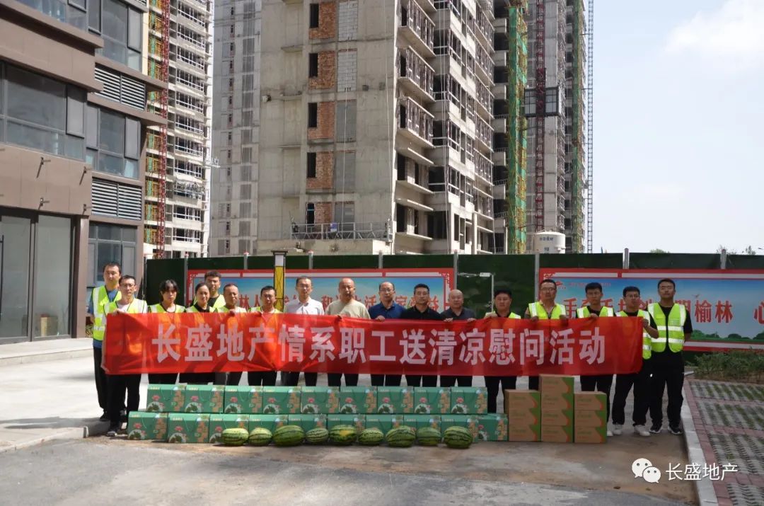 7月13日,榆林市長盛集團房地產開發(fā)有限公司開展2022年度“情系職工送清涼”慰問活動,看望慰問榆林區(qū)內在建項目一線員工,為他們送去小米、綠豆、白糖、西瓜等防暑降溫物品。