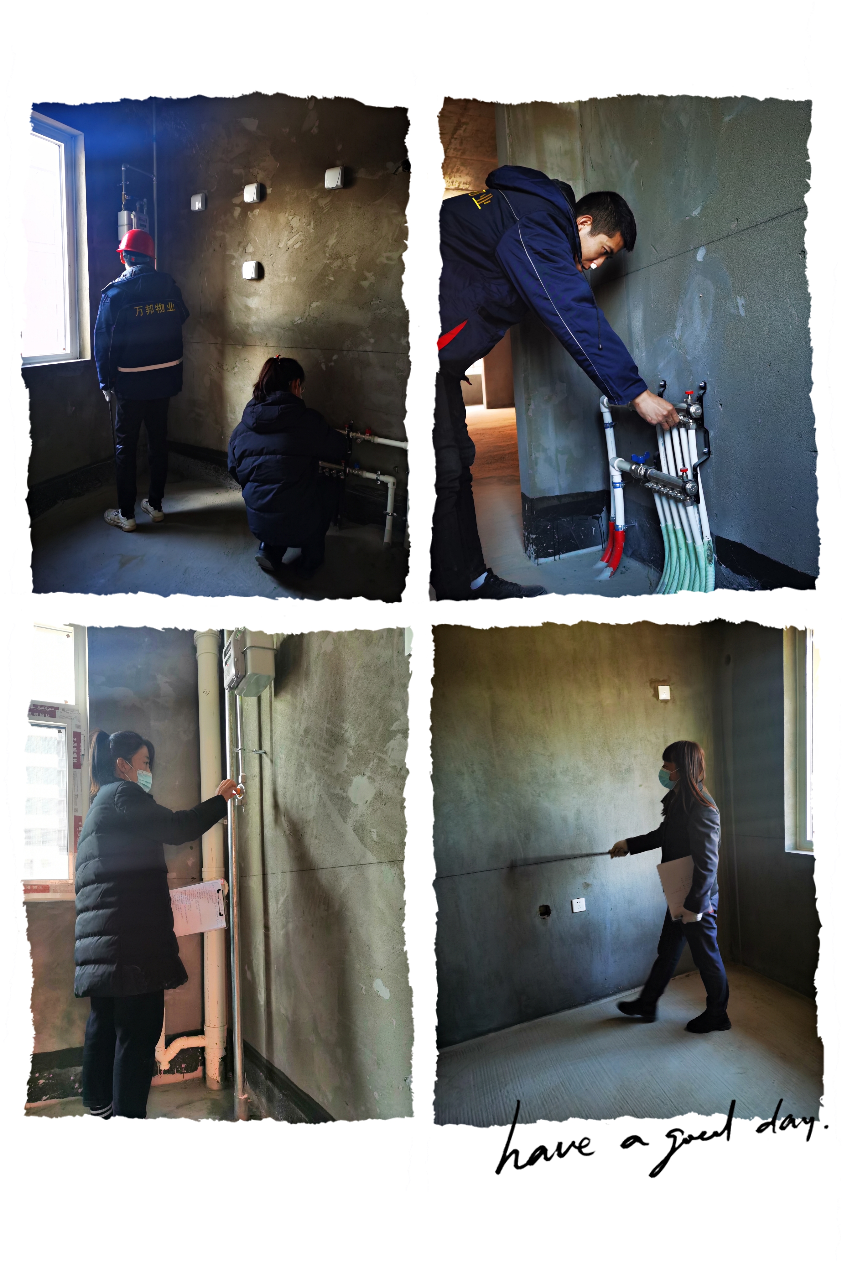 為了確保驗(yàn)房進(jìn)度和質(zhì)量,物業(yè)中心實(shí)行兩人一組分組操作,工程部工作人員負(fù)責(zé)檢驗(yàn)實(shí)操,客服部工作人員負(fù)責(zé)記錄登記。一絲不茍、兢兢業(yè)業(yè)走進(jìn)每一戶、查看每一面墻、測試每一個(gè)分水器、檢查每一扇窗,及時(shí)地將發(fā)現(xiàn)的問題記錄并反饋給施工方修繕處理。