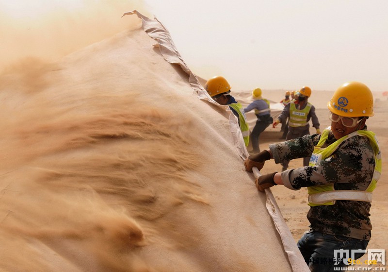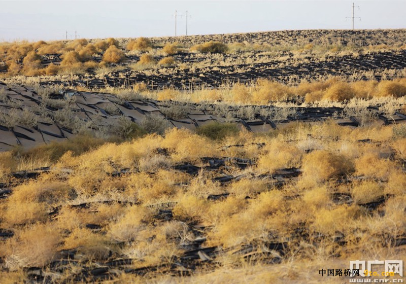 沙漠龍:在巴丹吉林沙漠,沙土每年平均移動速度大約有18米,如果不固定住移動沙丘,流沙很容易覆蓋公路。固沙關鍵是一個個2米長、20公分寬的填充式黑色沙袋。這些沙袋呈田字形交叉疊放,然后形成一個個1平方米的小方格,連成一片。沙袋在設計很特別,是有鰭沙袋,編織袋邊沿會留出3公分的穗兒,別小看這些穗,不單能減小風速,還能把吹起來的沙留在框格內。沙袋的面料采用的是耐寒耐曬材質,至少可以保持20年。第一項目部工程師王大偉說,根據(jù)風向,不同路段、不同方向鋪設的沙袋群,寬度都有精確計算。